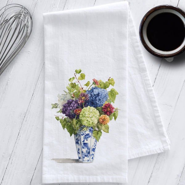 Designed exclusively by our Studio 901 Goods team, this tea towel features original watercolor artwork showcasing a lush bouquet of hydrangeas and zinnias in radiant shades of blue, green, purple, and coral. The elegant chinoiserie vase adds a touch of refined sophistication, perfect for gifting or elevating your everyday kitchen.