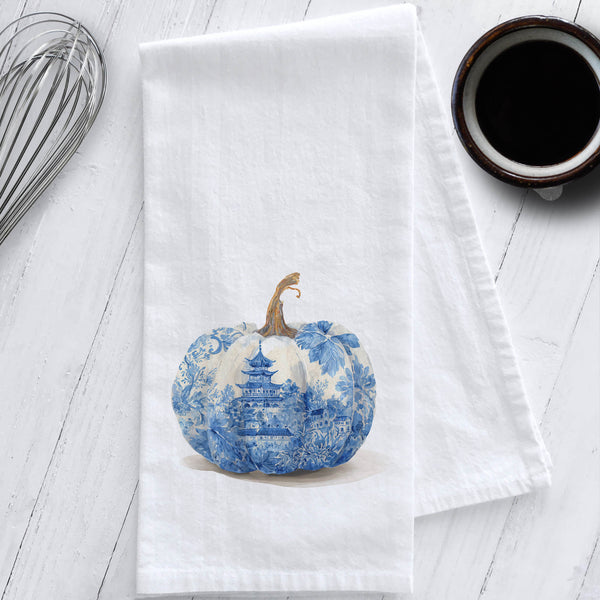 Elegant blue and white Chinoiserie pumpkin tea towel adds timeless fall charm to your kitchen. Perfect for gifting, decor, or entertaining this season.