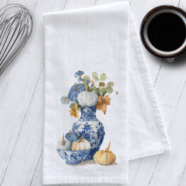 This beautiful flour sack towel features original watercolor artwork of a blue and white chinoiserie vase and bowl filled with soft-toned pumpkins, delicate fall florals, and golden leaves. It’s a graceful nod to autumn, blending Southern charm with timeless chinoiserie style.